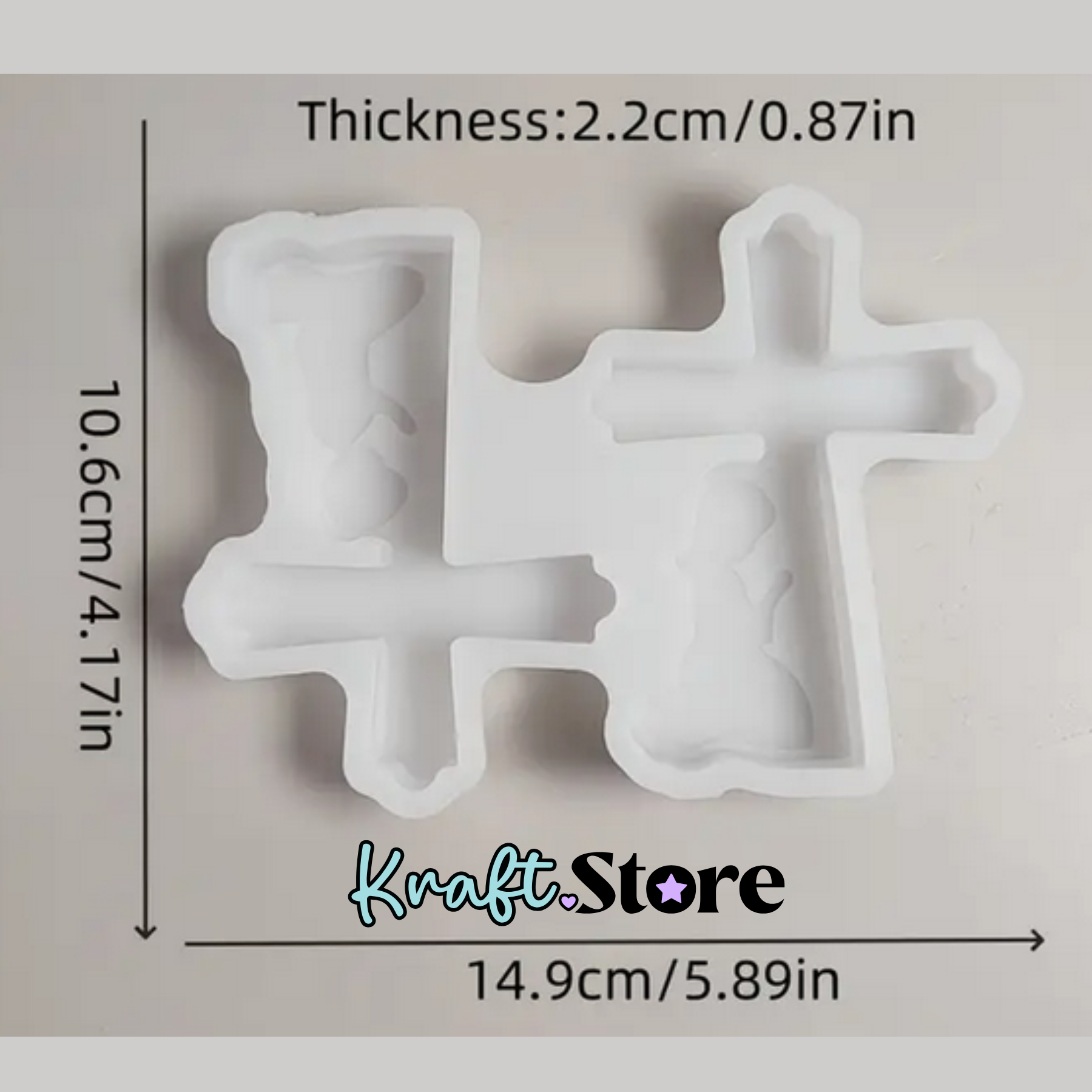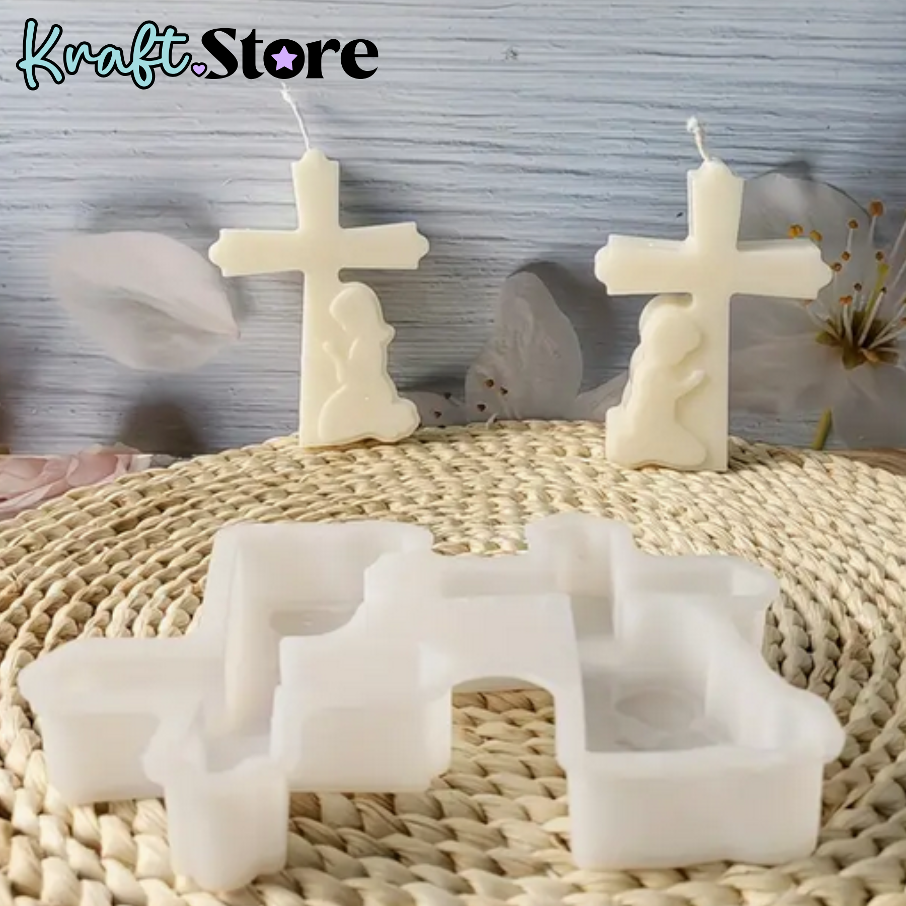 Molde de silicona con un hermoso diseño de cruz con niños rezando, ideal para crear velas con un toque espiritual y tierno. Perfecto para recordatorios de bautizo, primera comunión o decoraciones religiosas.