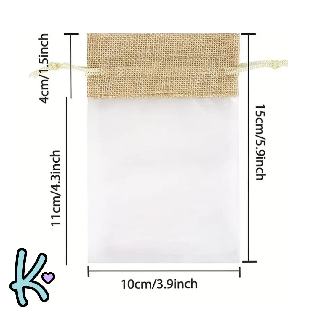 Fundas elaboradas en yute natural de alta calidad, ideales para empaques artesanales, recuerdos y detalles decorativos. Su textura rústica y elegante las convierte en la opción perfecta para realzar la presentación de tus productos o regalos, aportando un estilo ecológico y sostenible.