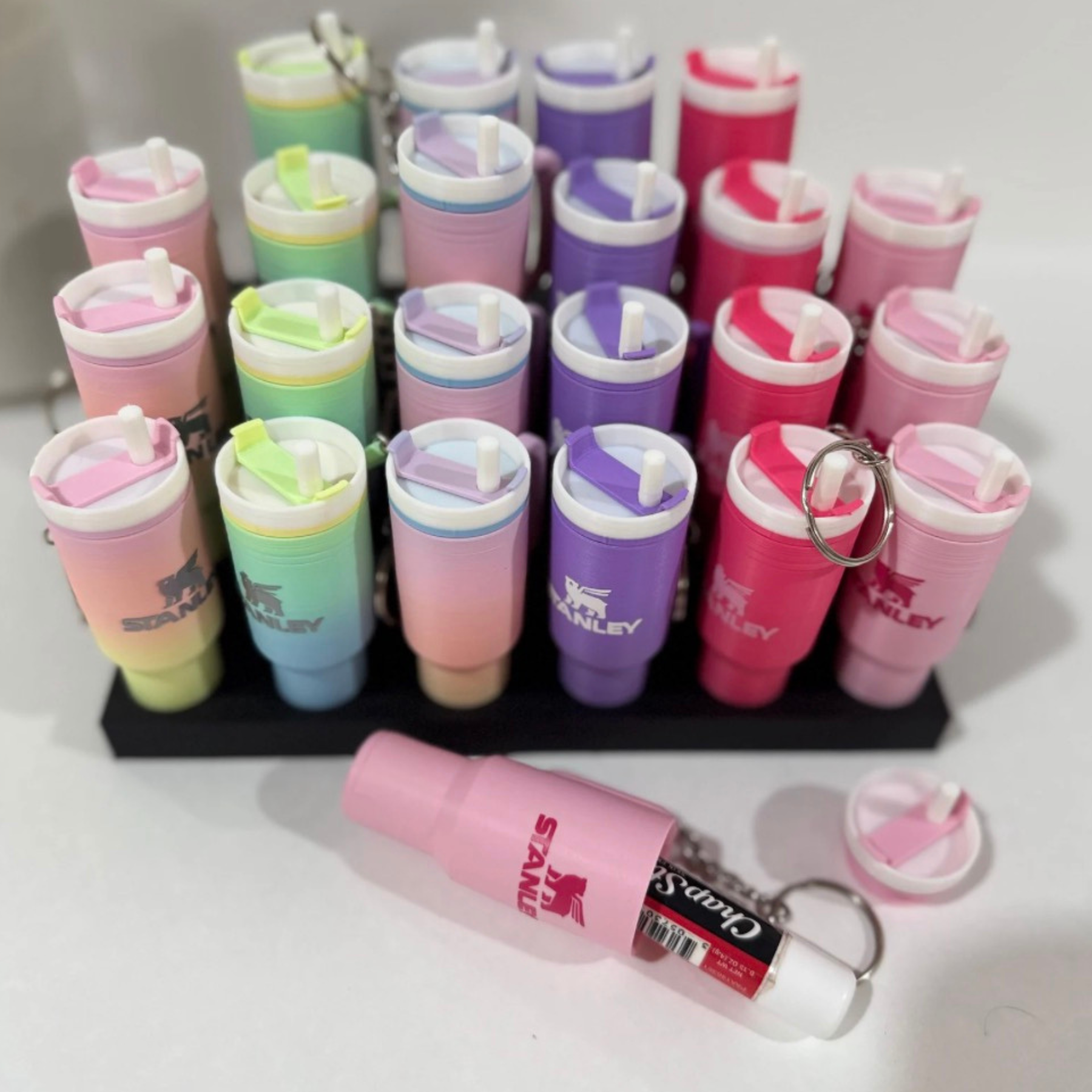 Este increíble mini llavero en forma de vaso “Tumbler”, fabricado con impresión 3D de alta precisión, no es solo un accesorio decorativo. Cuenta con una tapa funcional enroscable que te permite guardar discretamente un protector labial (Chapstick), billetes, pastillas o pequeños objetos.