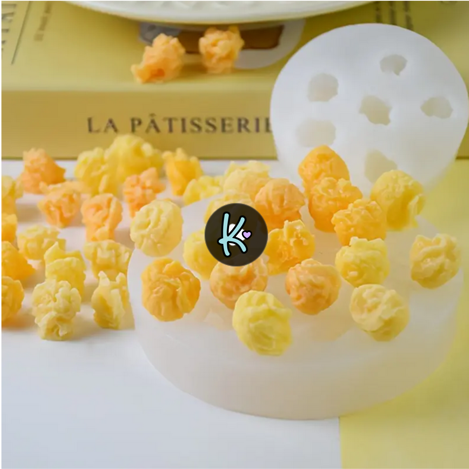 Molde de silicona con diseño realista de granos de canguil reventados, ideal para crear velas divertidas y originales. Perfecto para velas temáticas, decoraciones de cocina o como detalle artesanal.
